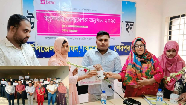 “পার করেছি আঠারো, পেরিয়ে যাবো পাহাড়ও” এ স্লোগানকে সামনে রেখে শেরপুরের ঝিনাইগাতীতে স্বপ্নসারথি গ্র্যাজুয়েশন অনুষ্ঠান অনুষ্ঠিত হয়েছে। আজ ৬ অক্টোবর সোমবার বিকেলে উপজেলা পরিষদ হল রুমে ব্র্যাক সামাজিক ক্ষমতায়ন ও আইনি সুরক্ষা কর্মসূচির আয়োজনে অনুষ্ঠানে প্রধান অতিথি হিসেবে উপস্থিত ছিলেন উপজেলা নির্বাহী অফিসার (ইউএনও) মো. আশরাফুল আলম রাসেল। ব্র্যাক শেরপুর জেলা সমন্বয়ক ফারহানা মিল্কির সভাপতিত্বে এবং ব্র্যাক সামাজিক ক্ষমতায়ন ও আইনি সুরক্ষা কর্মসূচির জেলা ব্যবস্থাপক বিদ্যুৎ কুমার নন্দীর সঞ্চালনায় বিশেষ অতিথি হিসেবে উপস্থিত ছিলেন উপজেলা সমাজসেবা কর্মকর্তা সানজা হোসাইন সানী, উপজেলা মহিলা বিষয়ক কর্মকর্তা আশরাফুল আলম, ব্র্যাকের অফিসার সেলপ মিজানুর রহমান, হোসনে আরা পারভীন প্রমুখ। এছাড়াও উপজেলা প্রশাসনের কর্মকর্তা, স্থানীয় প্রতিনিধি ও স্বপ্নসারথি কিশোরীরা উক্ত অনুষ্ঠানে অংশ নেন। অনুষ্ঠানে উপজেলার ১০টি স্বপ্নসারথি দলের ২৭ জন ১৮ বছর পূর্ণ করা কিশোরীকে সনদপত্র প্রদান করা হয়। প্রধান অতিথি তার বক্তব্যে বলেন, “দেশের সার্বিক উন্নয়নের জন্য সকলকে ধর্ম-বর্ণ-গোত্রের ভেদাভেদ ভুলে একসাথে এগিয়ে যেতে হবে। নাগরিক হিসেবে অধিকার ও কর্তব্য সম্পর্কে সবাইকে সচেতন হতে হবে। বিশেষ করে নারীদের সকল ক্ষেত্রে অংশগ্রহণের মাধ্যমেই সমাজ এগিয়ে যাবে। এলাকায় কোথাও বাল্যবিয়ে সংগঠিত হলে সরকারি হটলাইন বা উপজেলা প্রশাসনের নম্বরে ফোন দিতে হবে।” অনুষ্ঠানে অংশ নেওয়া কিশোরীদের পক্ষ থেকে অনুভূতি প্রকাশ করেন মিম মেঘলা ও তন্নী আক্তার।