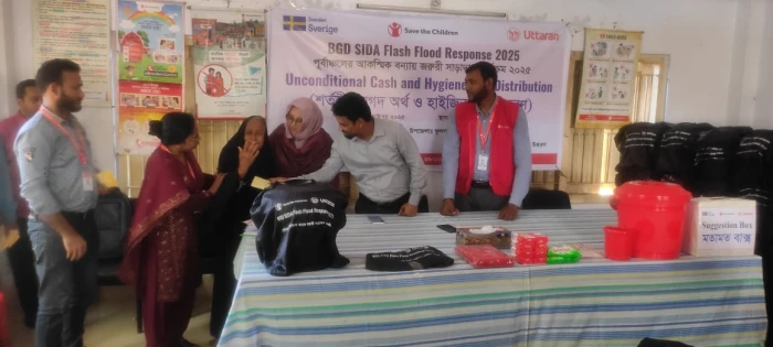 গত ইংরেজী ২০,২১ এবং ২২ অক্টোবর ২০২৫ তারিখ দাতা সংস্থা সিডা এর অর্থায়নে সেভ দ্য চিলড্রেন ইন্টারন্যাশন্যাল এর সহযোগিতায় উত্তরণ কর্তৃক বাস্তবায়িত BGD SIDA Flash Flood Response 2025 প্রকল্পের মাধ্যমে ফেনী জেলার ফুলগাজী উপজেলার ফুলগাজী সদর, মুন্সিরহাট ও দরবারপুর ইউনিয়নের বন্যায় ক্ষতিগ্রস্থ ৯০০ জন উপকারভোগীদের মাঝে শর্তহীন নগদ টাকা ও হাইজিন কিটস প্রদান করা হয়েছে। উক্ত বিতরণ অনুষ্ঠানে উত্তরণ এর প্রকল্প সমন্বয়কারী হাসিনা পারভীন এবং ইউনিয়ন পরিষদের সার্বিক ব্যবস্থাপনায়, প্রধান অতিথি হিসাবে উপস্থিত ছিলেন ফুলগাজী উপজেলার সহকারী কমিশনার, ভূমি, মাশিয়াত আক্তার, বিশেষ অতিথি হিসাবে উপস্থিত ছিলেন দায়িত্বপ্রাপ্ত কর্মকর্তা-ফুলগাজী সদর ইউনিয়ন এবং উপজেলা একাডেমিক সুপারভাইজার জনাব মোঃ মোয়াজ্জেম হোসাইন, দায়িত্বপ্রাপ্ত কর্মকর্তা- মুন্সিরহাট ইউনিয়ন ও উপজেলা কৃষি কর্মকর্তা জনাব মোঃ খোরশেদ আলম এবং দায়িত্বপ্রাপ্ত কর্মকর্তা- দরবারপুর ইউনিয়ন ও উপজেলা যুব উন্নয়ন কর্মকর্তা জনাব মোঃ মাসুদুল হক। আরও উপস্থিত ছিলেন, স্ব স্ব ইউনিয়নের প্রশাসনিক কর্মকর্তাগণ এবং সহযোগি সংস্থা সেভ দ্য চিলড্রেন এর অন্তরা দাস তিথি সিনিয়র অফিসার-হিউম্যানিটারিয়ান, মোঃ মোস্তাফিজুর রহমান - প্রজেক্ট অফিসার এবং উত্তরণ এর প্রকল্প স্টাফগণ।