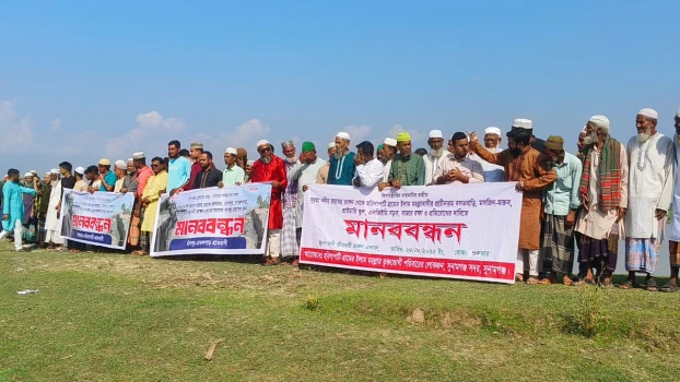 সুরমা নদীর ভয়াবহ ভাঙ্গন রোধে হরিনাপাটি গ্রামবাসীর মানববন্ধন